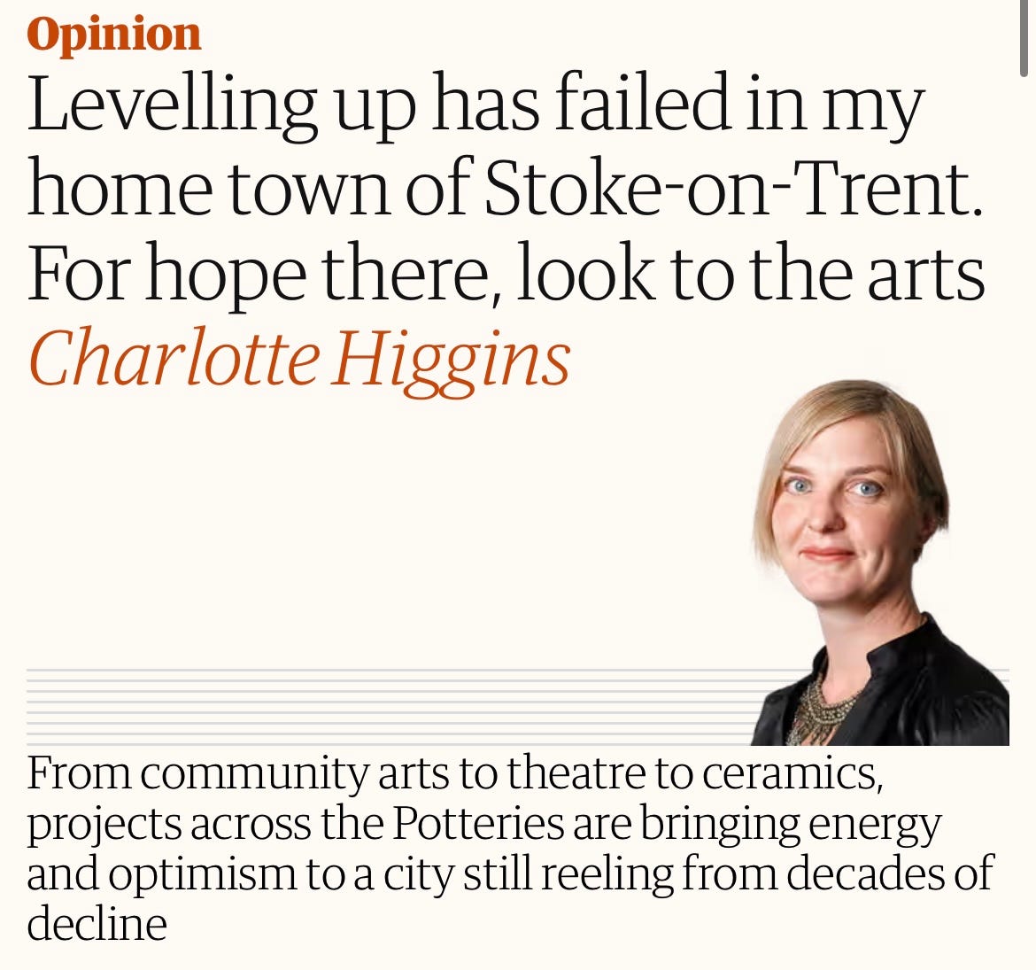 “For hope there, look to the arts” Charlotte Higgins, Chief Culture Writer for The Guardian is a Stoke alumni and writes this well-rounded piece on levelling up in Stoke-on-Trent. Refreshingly, she examines the energy around Stoke art and creative projects that are capturing people’s hearts and our collective imagination. Portland Inn Project gets lots of well deserved attention, alongside Claybody Theatre, the creative community at Spode and BCB.