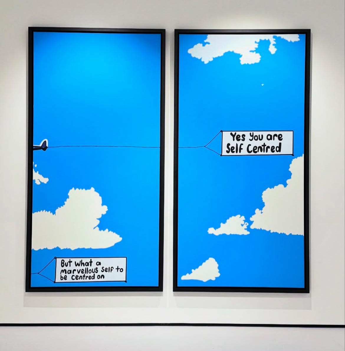 With one of his pieces reading “I was mentally ill before it was cool”, and another “I want all of the attention and at the same time none at all”, you’re left staring blankly, cartoon-blinking into space as your head empties with the emptiness of the art itself.