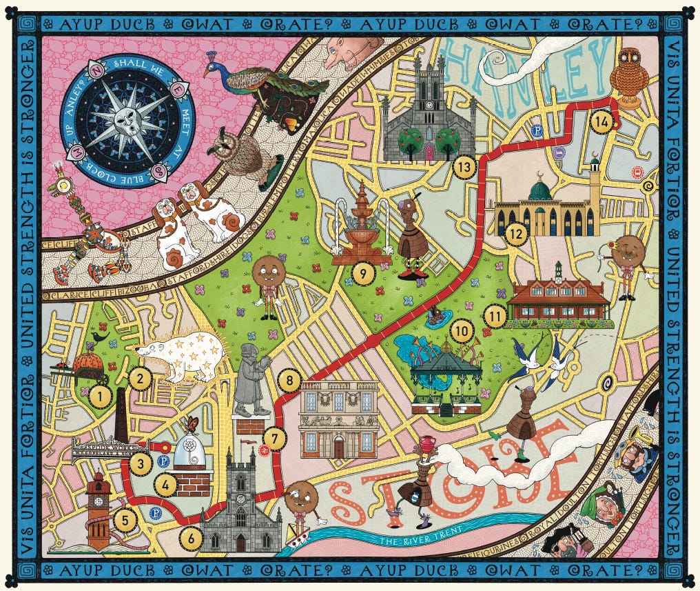 🚶♀️Walk Stoke’s Heritage Trail. A free interactive walking route between Stoke and Hanley, The Living Heritage City Trail went live last weekend. The app includes interactive videos and audio, which navigates users through the heritage locations and shares community stories, and is available alongside a newly-illustrated map by local artist Kidda Kinsey. Starting at Spode Works, the route, which takes just over an hour to walk, takes in Stoke Minster, Winton Square, Beresford Street, Hanley Park and St Marks Church in Shelton and ends at the Potteries Museum & Art Gallery. Local cultural and heritage organisations have developed additional trails along the route. More info on the app here.