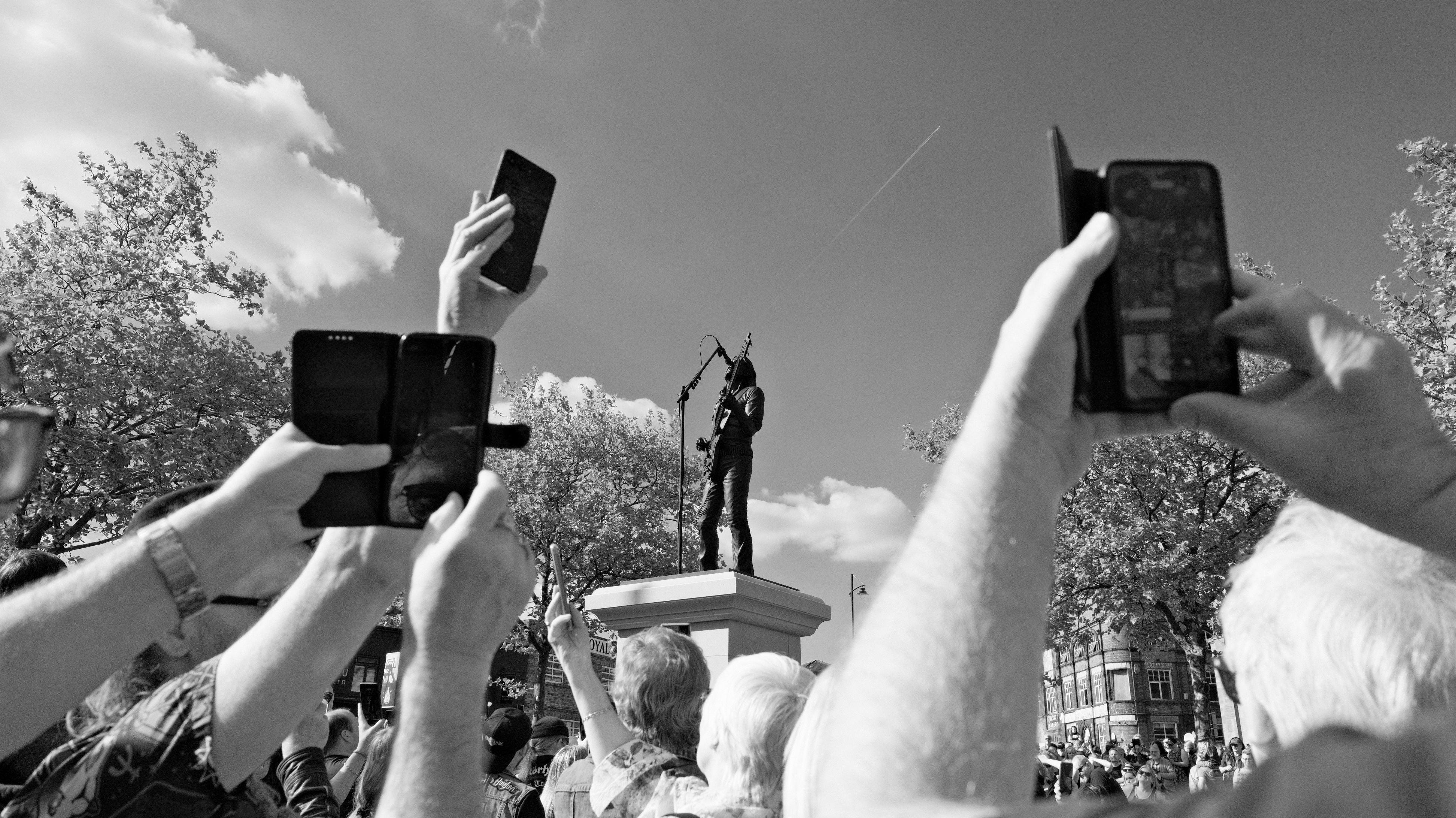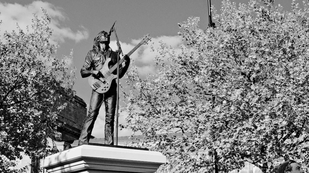 Statues, if they're any good, as well as simply geographical and historical markers can be like a kind of satellite dish, broadcasting and receiving the spirit of their subject, a kind of repository for shared feelings. To echo and celebrate the performance aspect of Shakepeare’s legacy, his bronze monument in Stratford uses statues of four of his characters: Prince Hal, Lady Macbeth, Hamlet, and Falstaff to conjure it, around a figure of the playwright in the middle. In Lemmy’s hometown it is the crowd of visitors and regular gatherings and live performances in the plaza that are called upon to respond to their electrified hero presented on a stage above them to evoke the energy and feeling that are such a vital part of Lemmy’s legacy. It is this ever present invitation of a beacon like lone figure high above a former empty square that marks out the concerted effort still required to raise Lemmy and Burslem to the status and number of visitors that Shakespeare’s Stratford enjoys.