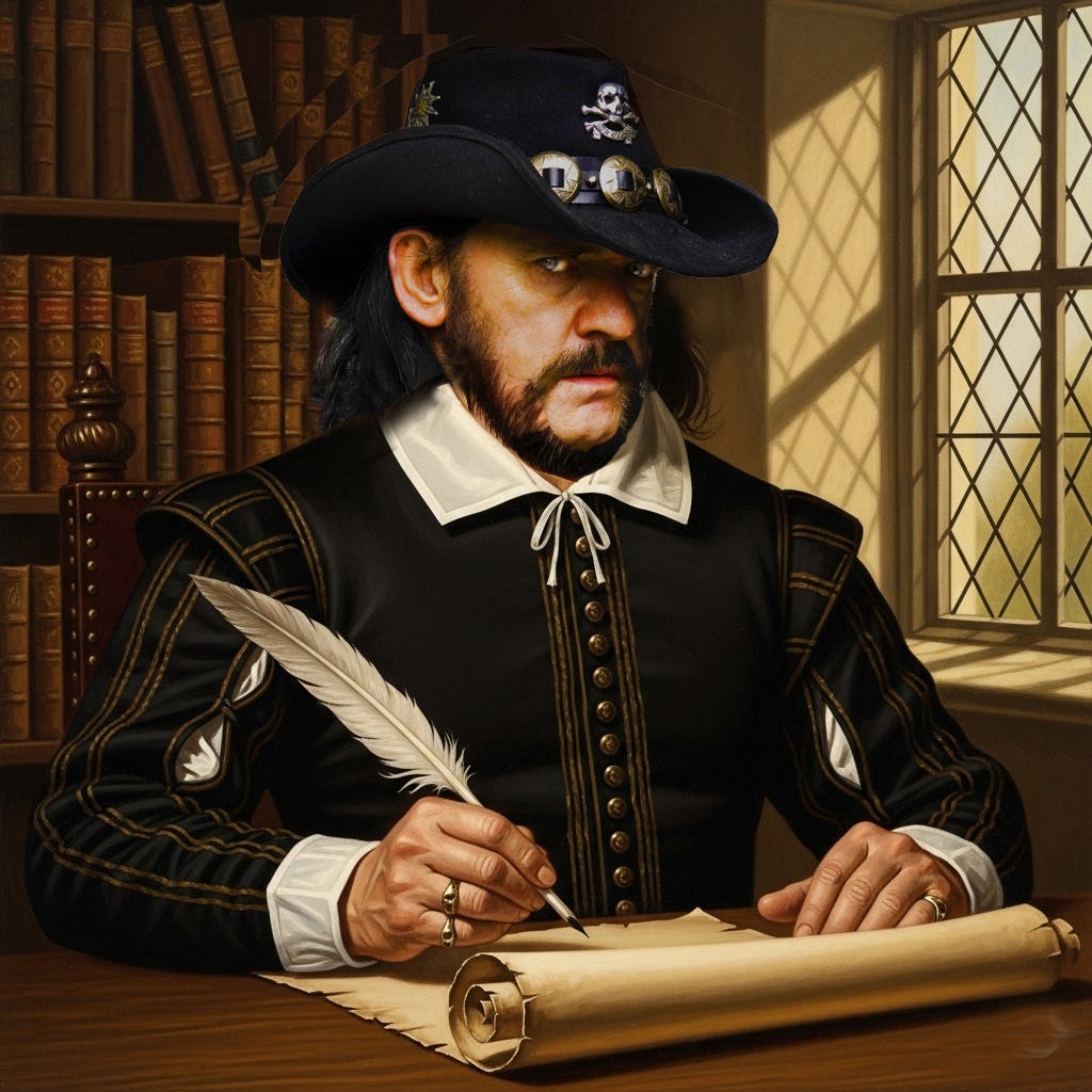 At the heart of both Lemmy and Shakespeare’s enduring appeal to their enthusiasts and fans lies in that unflinching honesty about the human condition. Shakespeare's tragedies, romances, and comedies, for all their poetic grandeur, are filled with the messy, complex, and often ugly truths of life. From the bloody ambition of Macbeth to the jealous fury of Othello, he captures a world driven by base passions, greed, and the search for meaning in a chaotic world. His characters, whether kings or commoners, feel authentic because they are plagued by the same anxieties and desires that have gripped humanity forever. Similarly, Lemmy's lyrics are a chronicle of a different but equally authentic passage through another time and reality.